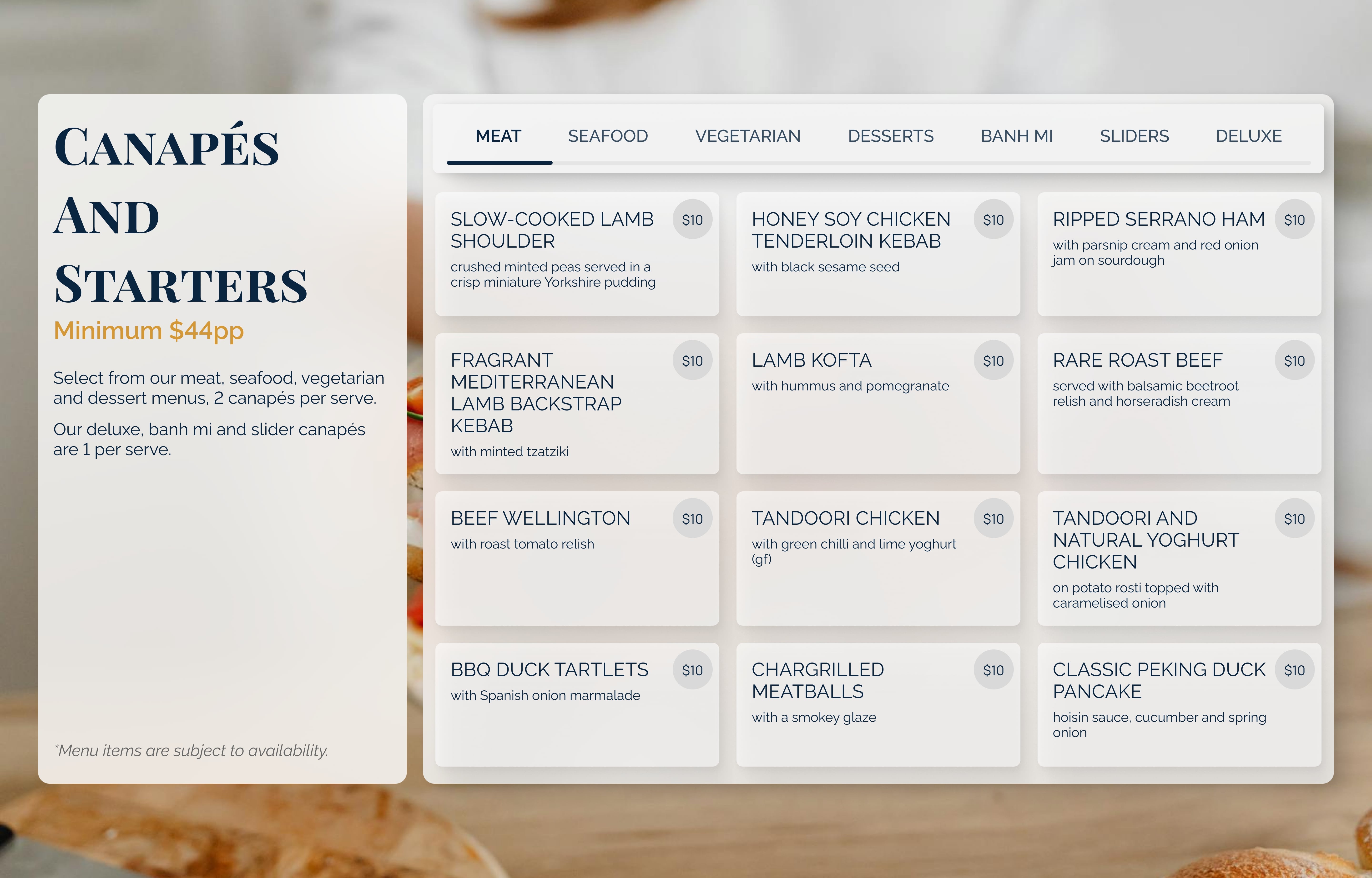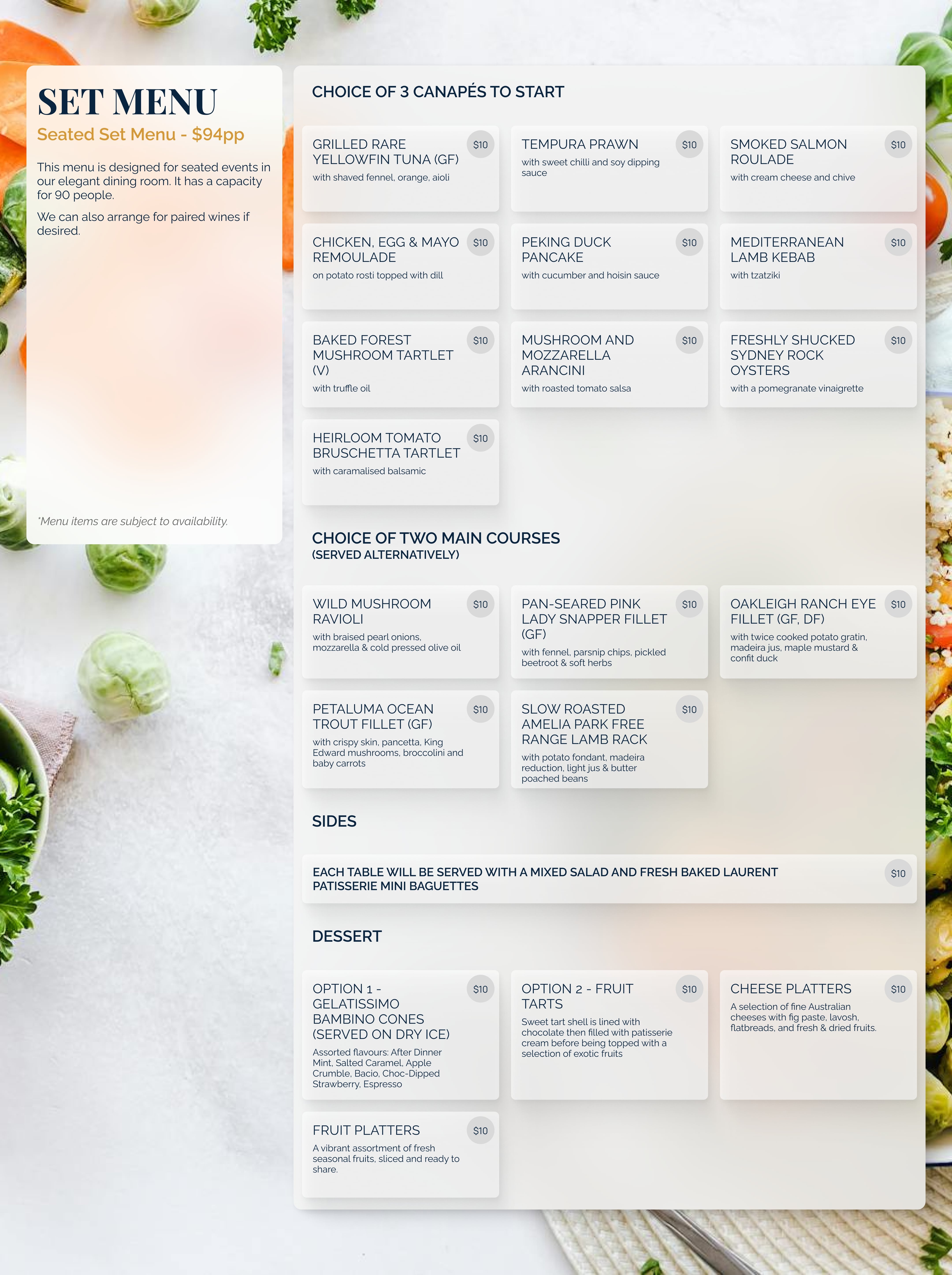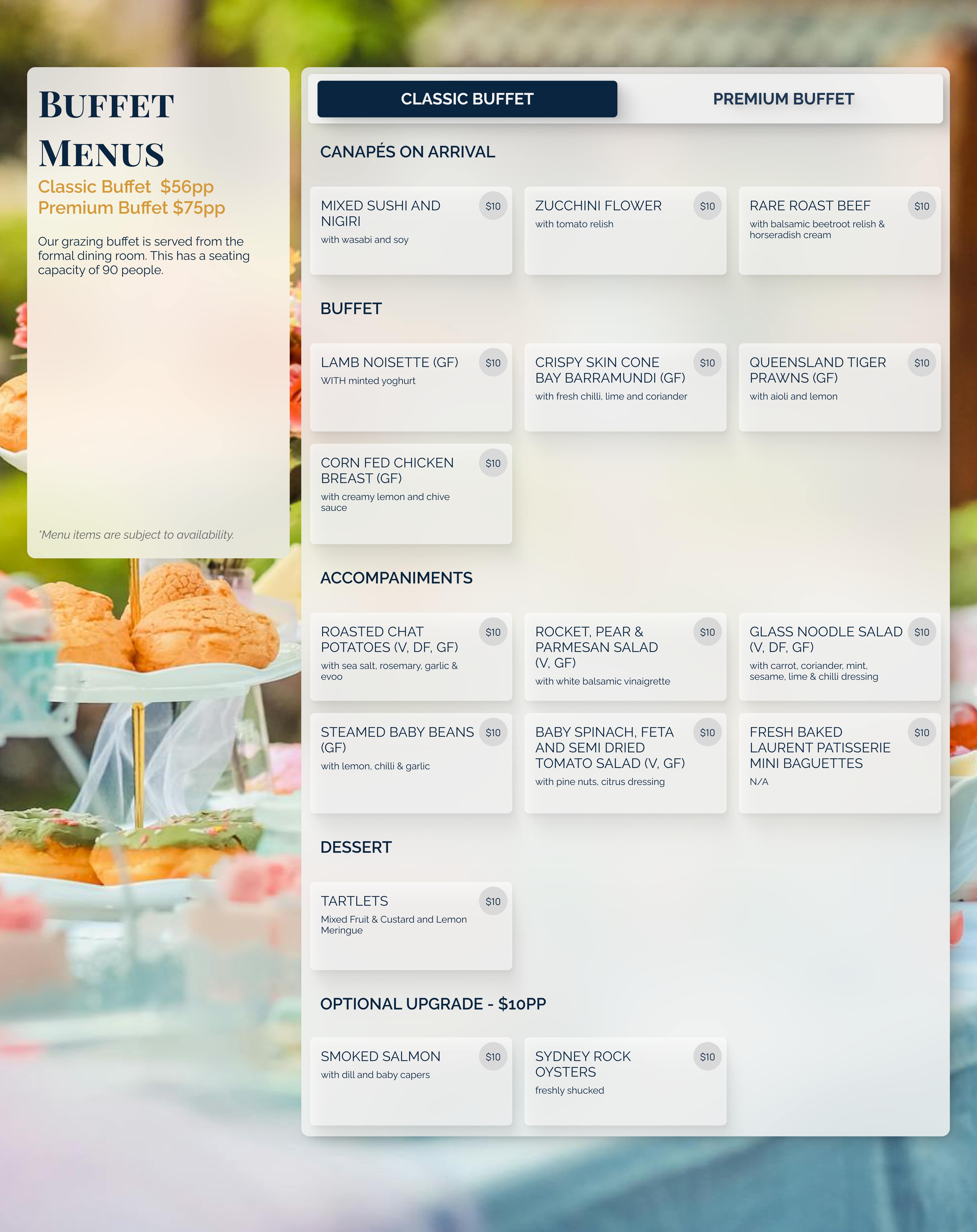 From standing cocktail affairs with roaming canapés to casual grazing buffets that include all your favourite dishes, to formal sit down dinners with the option of paired wines.