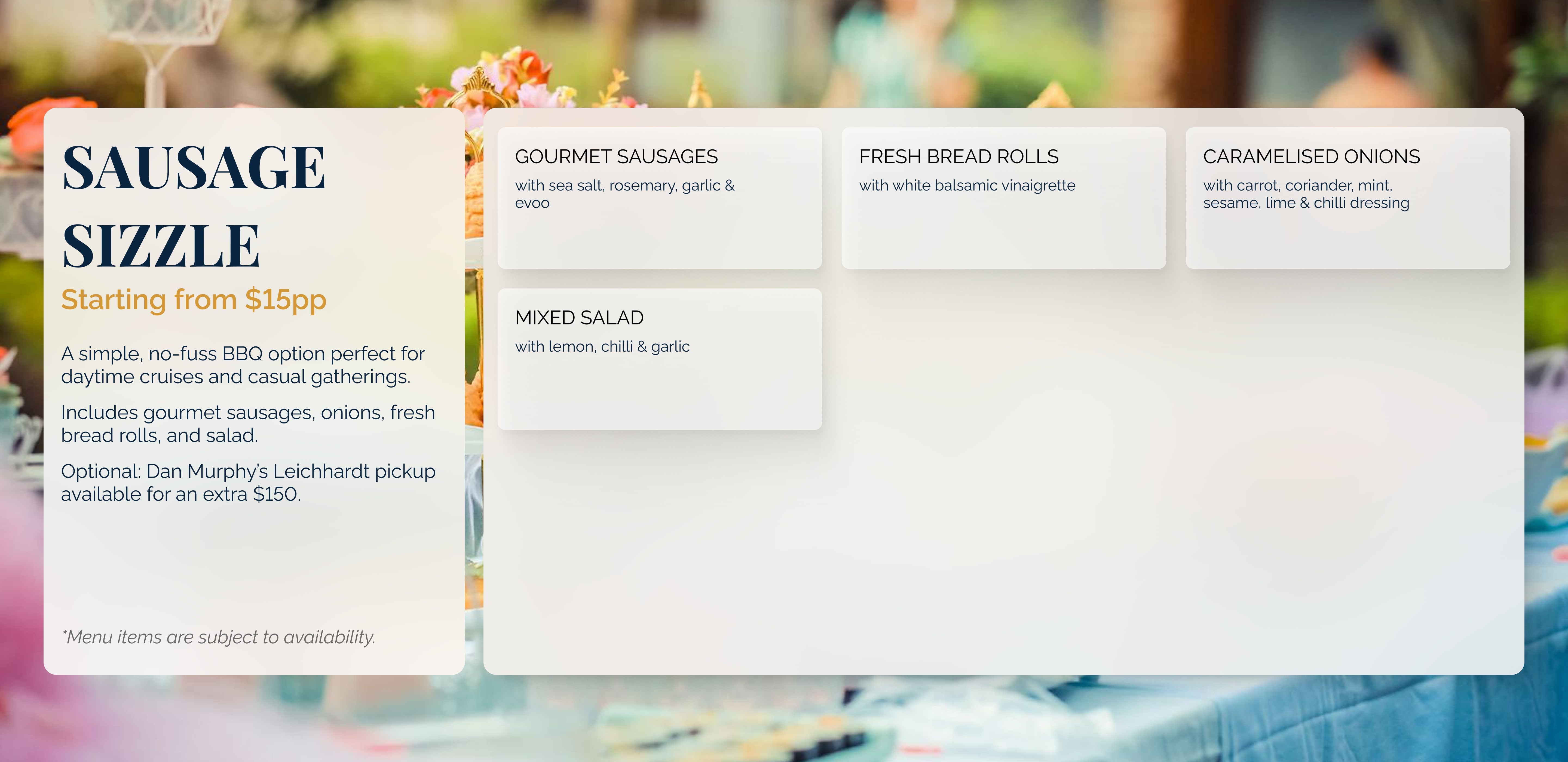 Whilst you can also BYO food, we offer two easy catering solutions at affordable prices, using our on deck BBQ.